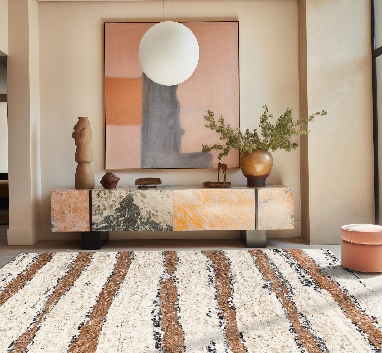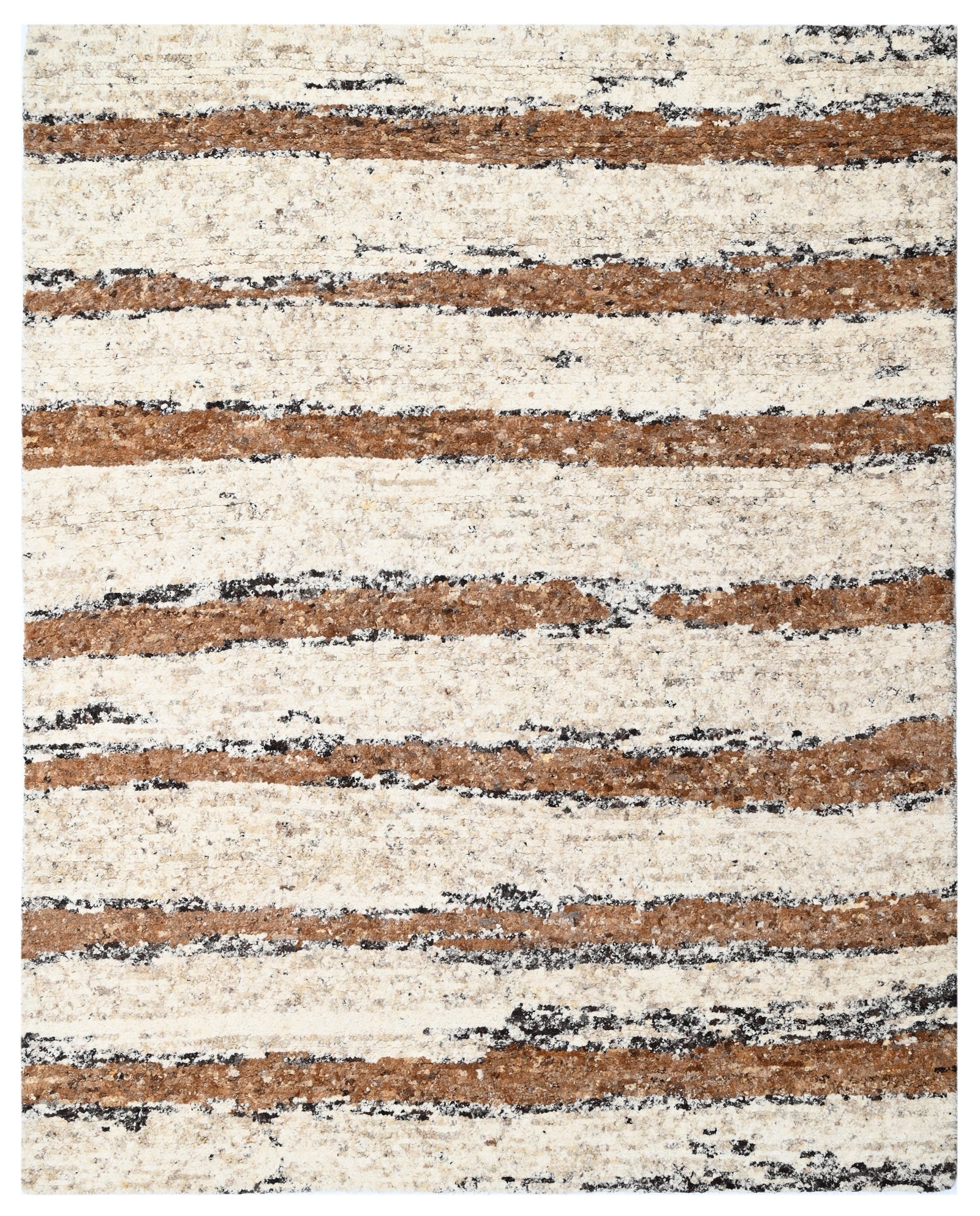 Rocky Beach hand-knotted wool rug in brown, ivory & neutral tones, abstract wave-inspired striated design with soft texture for earthy modern interiors.