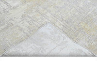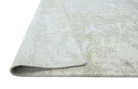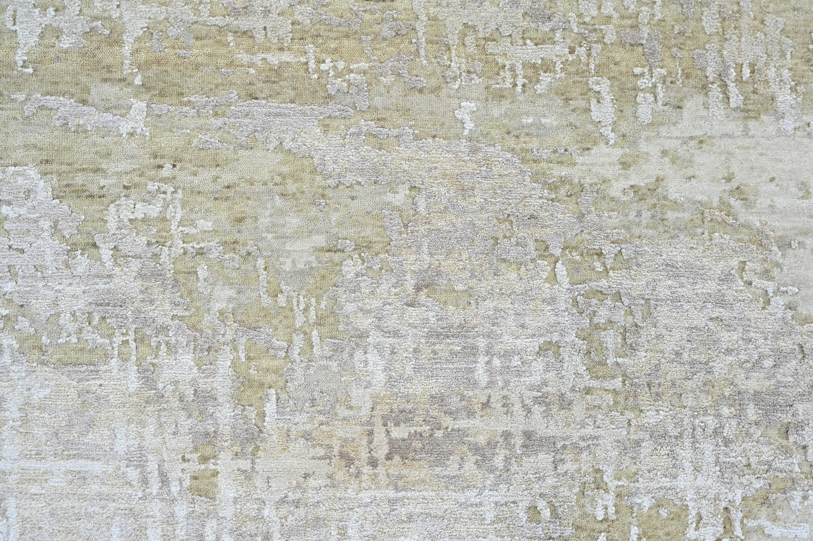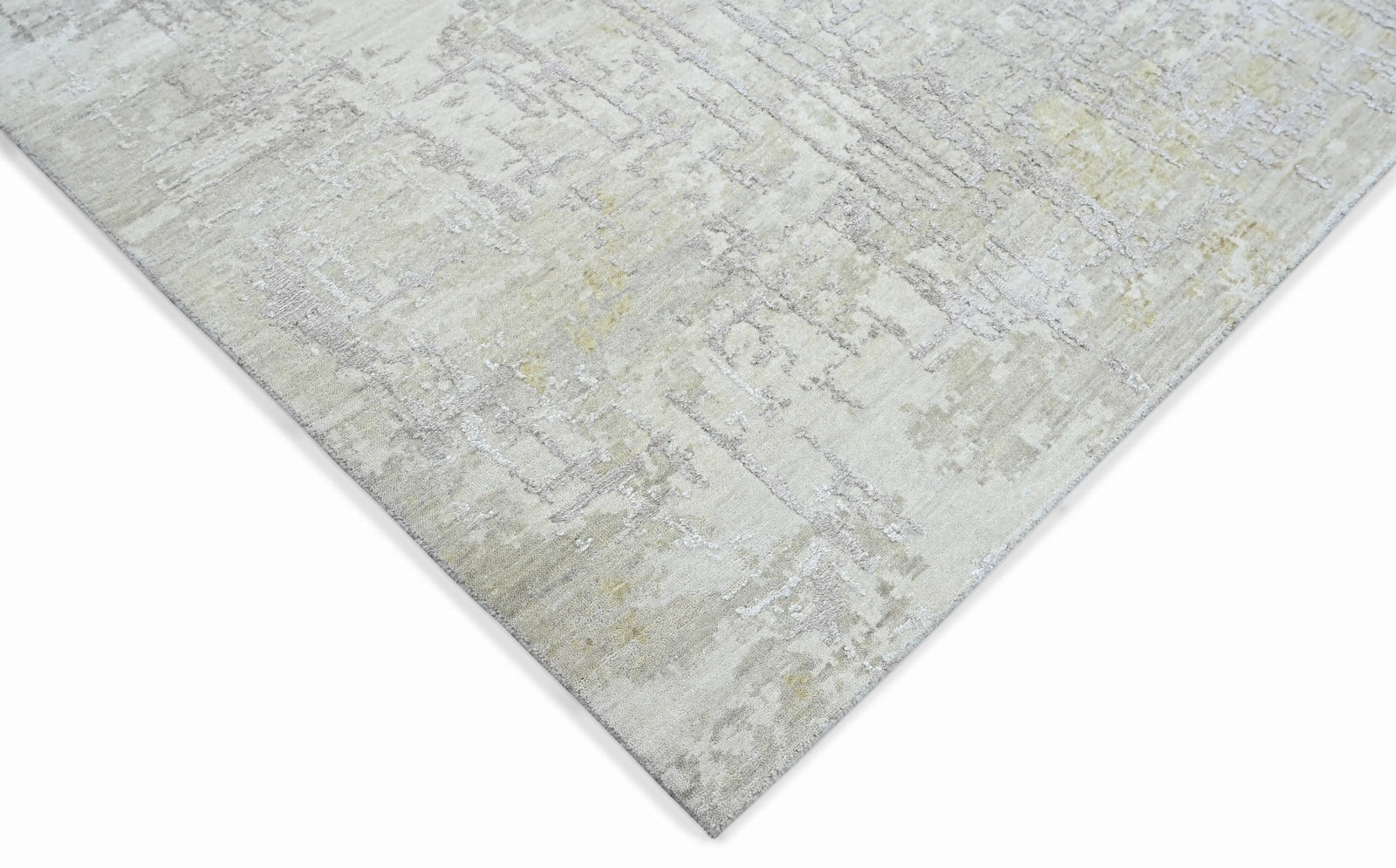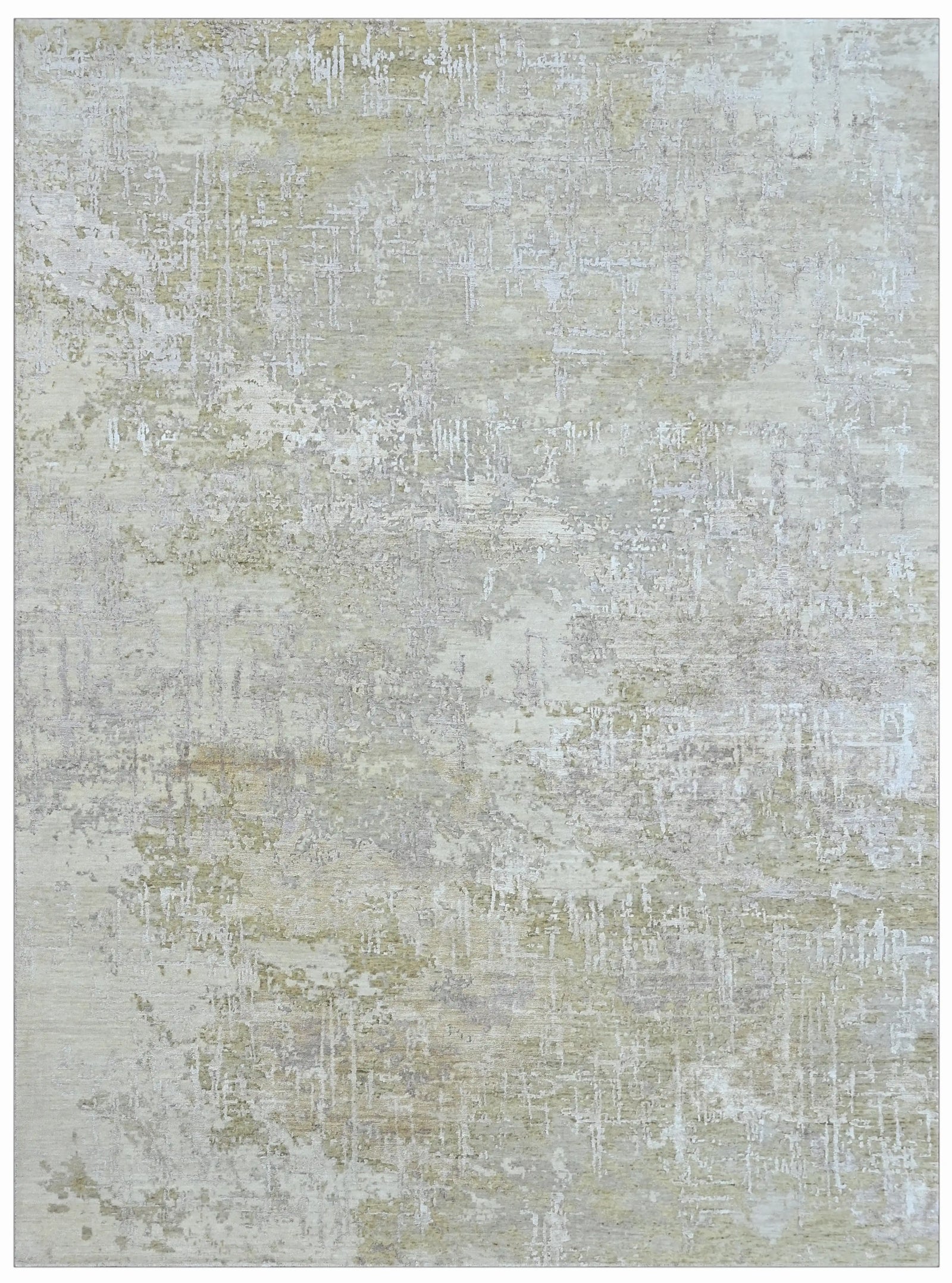 Silken Dusk hand-knotted Tibetan wool & silk rug in gold, silver & lavender-grey tones, abstract shimmer texture for serene luxury interiors.
