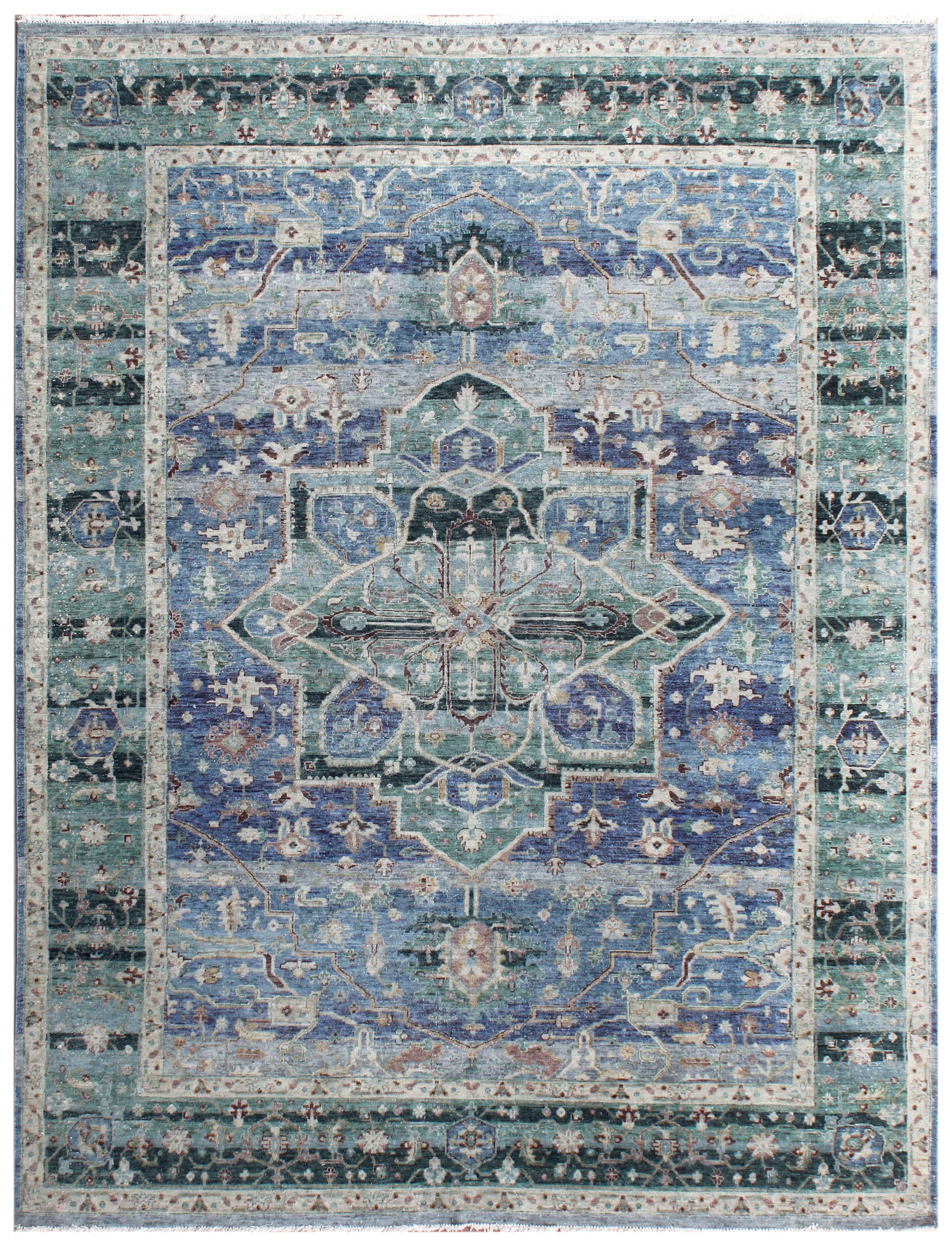 Drawing inspiration from the boundless beauty of the ocean, Antique Teal captures the essence of the sea’s rhythmic movement, reflecting its tranquility and grandeur in an intricately woven masterpiece. The harmonious blend of deep marine blues, soft seafoam greens, and delicate ivory hues evokes the ever-changing tides, coral reefs, and the endless depth of the open water. The symmetrical medallion design, reminiscent of ancient motifs, adds a timeless elegance, akin to patterns etched into the seafloor by gentle currents and the artistry of nature itself.