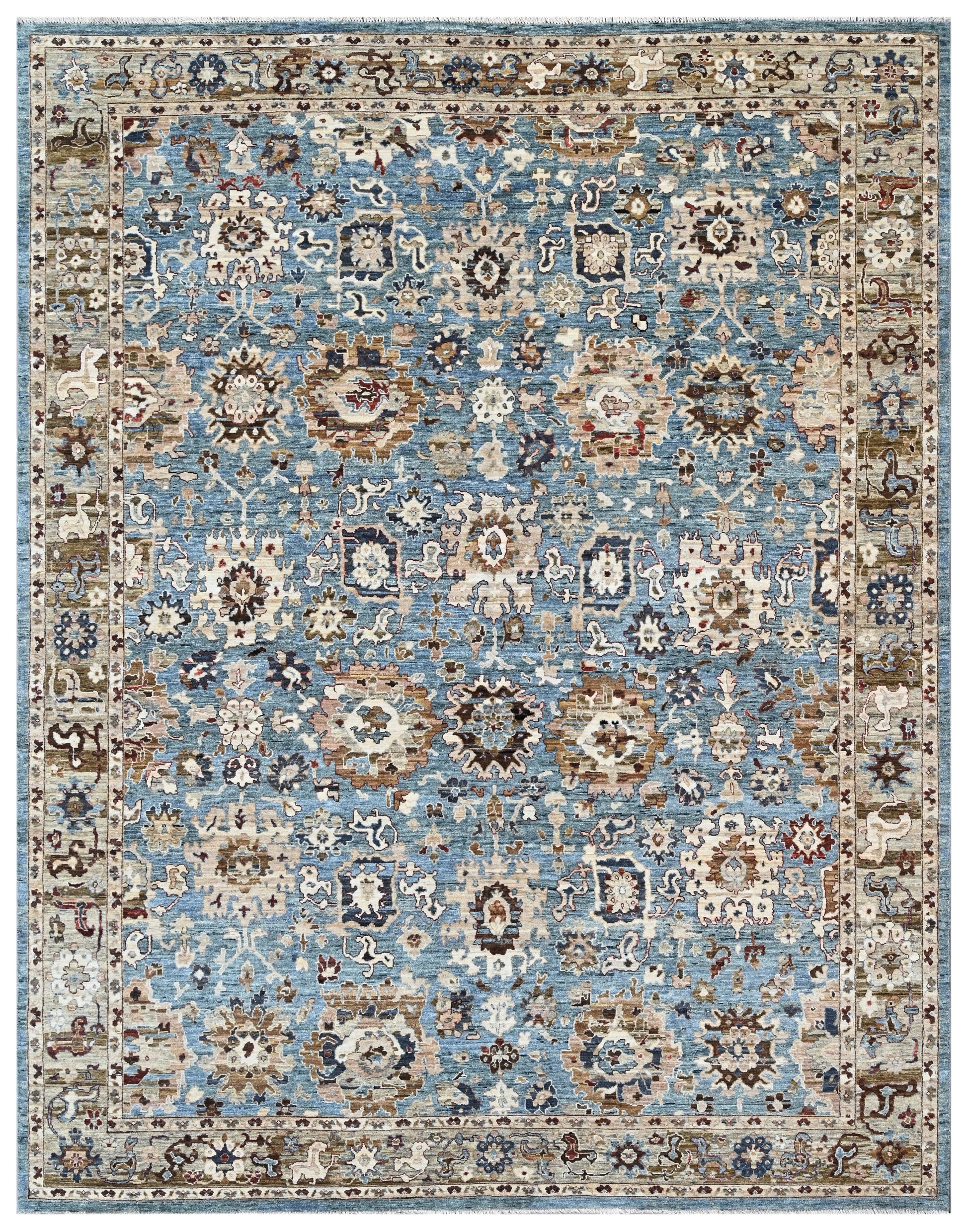 The luminous base of soft azure blue evokes a sunlit sky washed gently by time. Intricate floral medallions, rosettes, and vinery are scattered across the field in layers of muted ivory, warm sand, and earthy brown — reminiscent of the storied gardens and woven motifs of antique Persian textiles. Each detail is rendered with purpose, fading subtly at the edges to create an authentic abrash effect that adds depth, movement, and a sense of gentle history. What makes Azure Heirloom exceptional is its quiet balance — bold in color, yet softened by its timeworn finish. It adapts effortlessly to classic, transitional, or modern settings, grounding a space with tradition while lending a gentle breath of color. Whether layered in a library, sitting room, or bedroom, this rug becomes an instant focal point — inviting touch, anchoring conversations, and telling a story that feels familiar yet fresh. Azure Heirloom isn’t just a carpet. It’s a legacy underfoot — one woven with intention, echoing craftsmanship that lasts a lifetime. |