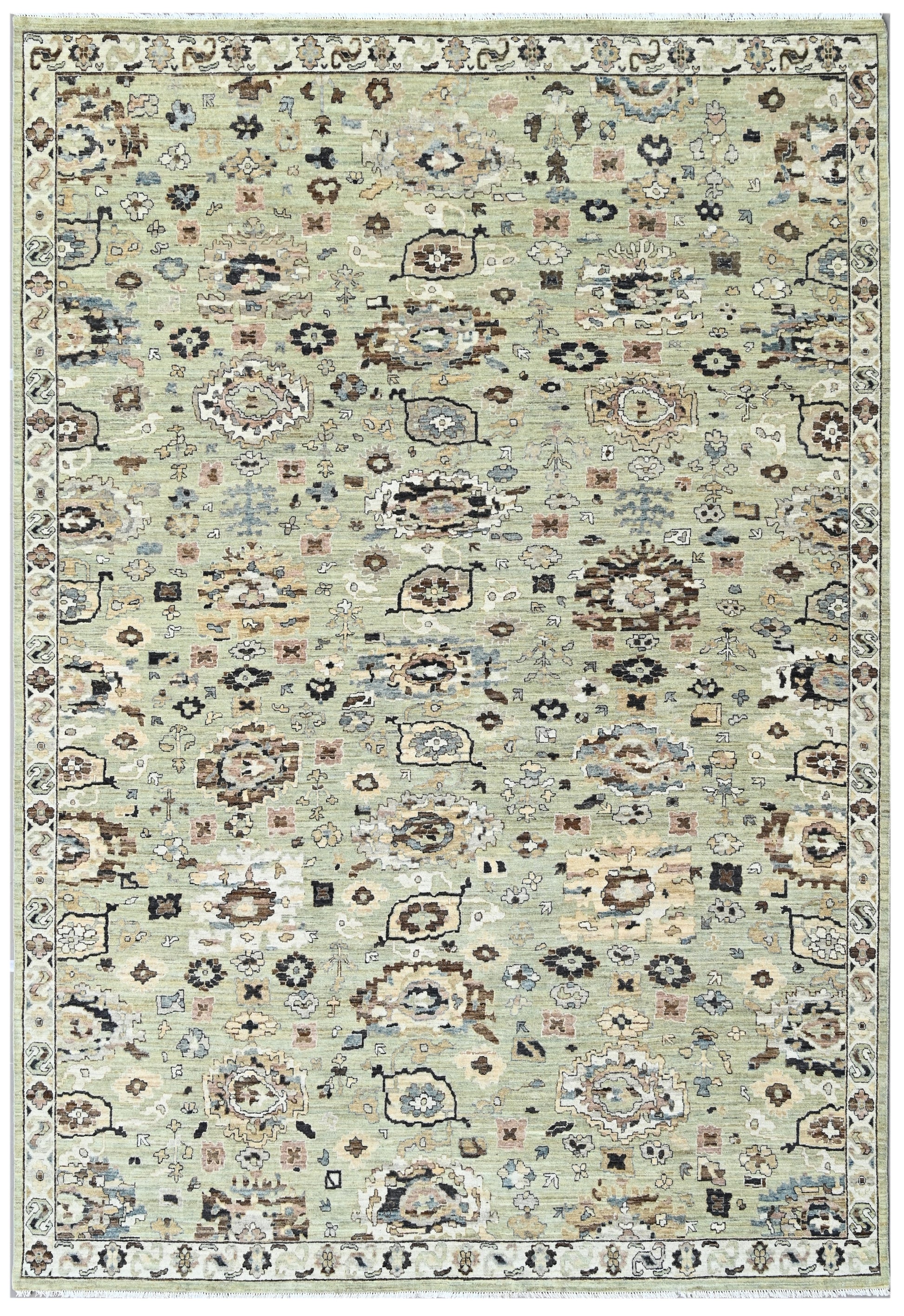 Bringing an earthy calm to ancestral design, Sagehollow Bijar from our Timeless Collection reinterprets the strength of Bijar craftsmanship through a lens of soft green serenity. Its tranquil sage base hosts a field of scattered medallions, floral abstractions, and angular symbols — each rendered in quiet tones of walnut brown, deep navy, and parchment ivory. The result is a rug that feels rooted in tradition but refreshed by nature.