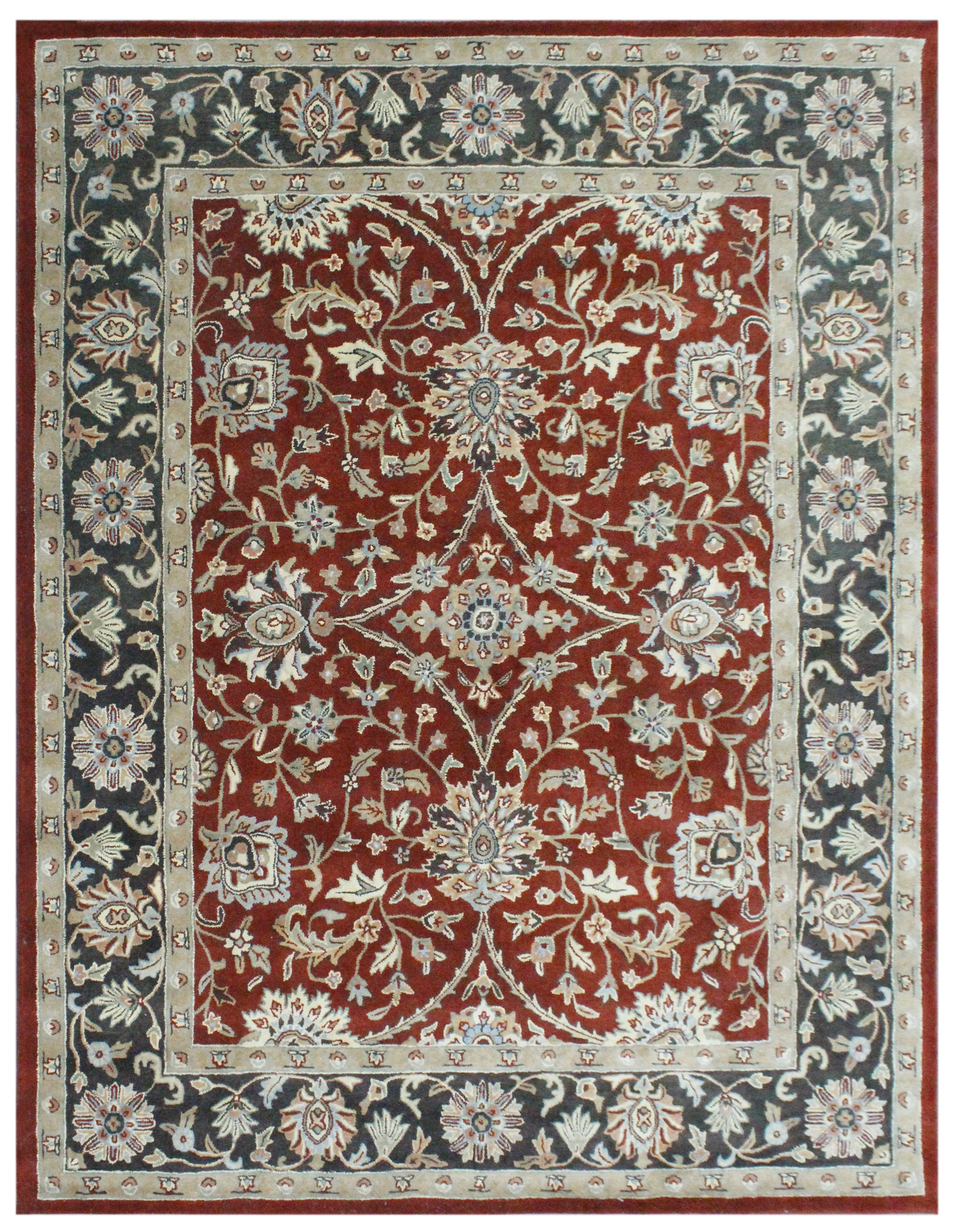 The “Crimson Majesty Classic” rug is a regal representation of timeless Persian-inspired design, woven to perfection for those who appreciate enduring elegance. At first glance, the deep crimson red field captures immediate attention, exuding richness and warmth. This bold backdrop is intricately adorned with ivory and soft grey floral motifs, carefully arranged in a symmetrical medallion-and-vine pattern that echoes centuries-old artistry. Surrounding the central field is a broad border in complementary shades of ivory and slate, decorated with delicate floral and vine scrolls, giving the piece a balanced and dignified finish.