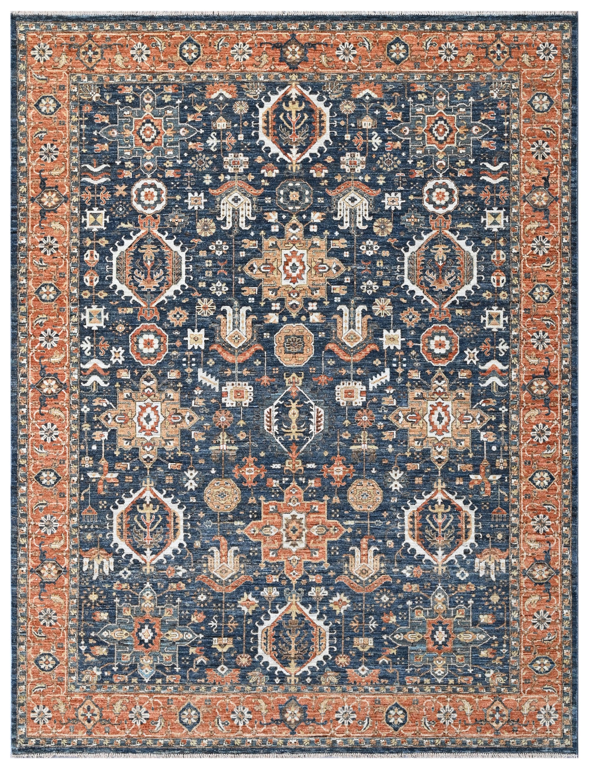 The central field is a canvas of structured motifs — medallions, arrowheads, blossoms, and stepped forms — laid out in rhythmic harmony. Each detail is framed with intention, offering a balanced visual rhythm that feels both ancient and architectural. The deep blue ground evokes the calm depth of twilight skies, while the terracotta-toned borders blaze around it like embers, lending the rug its name and its warmth. Crafted in 100% wool, Ember Mosaic is as tactile as it is visual — its dense pile offering softness underfoot and an enduring character meant to last generations. The Persian knot technique enables intricate clarity in pattern while enhancing the durability that hand-knotting is revered for. Whether placed in a study, a formal living room, or an entryway that speaks to heritage, this piece sets the tone with quiet authority and cultural soul. Part of the Timeless Collection, this rug is not merely decorative but expressive — telling a story through symmetry, contrast, and time-worn tradition. Ember Mosaic reminds us that beauty lives not only in the new but in the rooted — in pieces that speak across eras. |