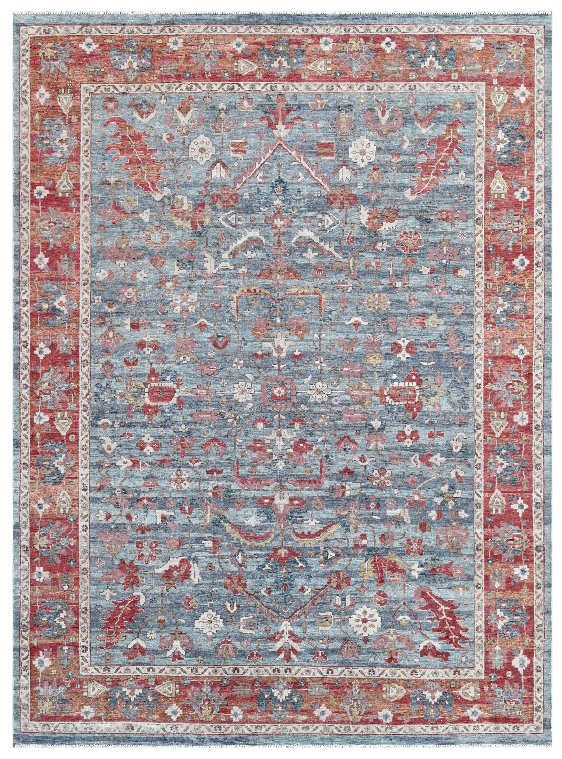 Vibrant and storied, Emberfield Sultanabad from our Timeless Collection is a radiant revival of classic Persian village rugs, reimagined with artisanal nuance. The design bursts with vitality — rows of stylized florals, leafy sprigs, and ornamental vines unfold across a washed sky-blue field, framed by a bold terracotta border adorned with symbolic medallions. This striking contrast of ember-red and weathered blue evokes the richness of ancient palaces and sun-drenched courtyards.