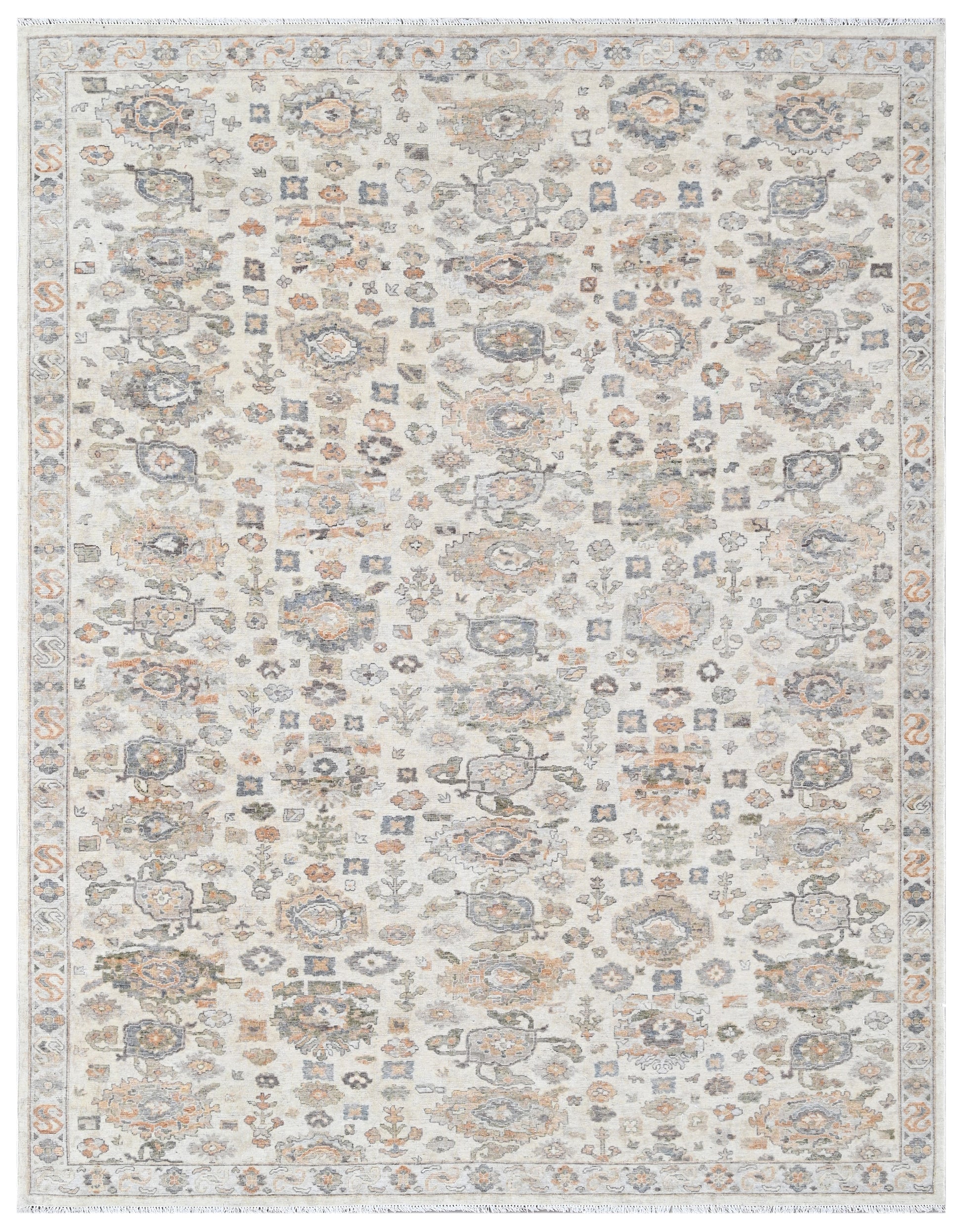 Elegant in its subtlety, Ivoryglen Khorasan from our Timeless Collection brings forth the poetic lightness of classic Persian carpets through a fresh, airy lens. Inspired by the delicate detailing of Khorasan weaving traditions, this rug features an intricate all-over layout of stylized blossoms, boteh, and latticework in a palette of ivory, soft greys, sandstone, and faded peach. The effect is ethereal — like an antique manuscript rendered in fabric, timeless and gently worn by history.