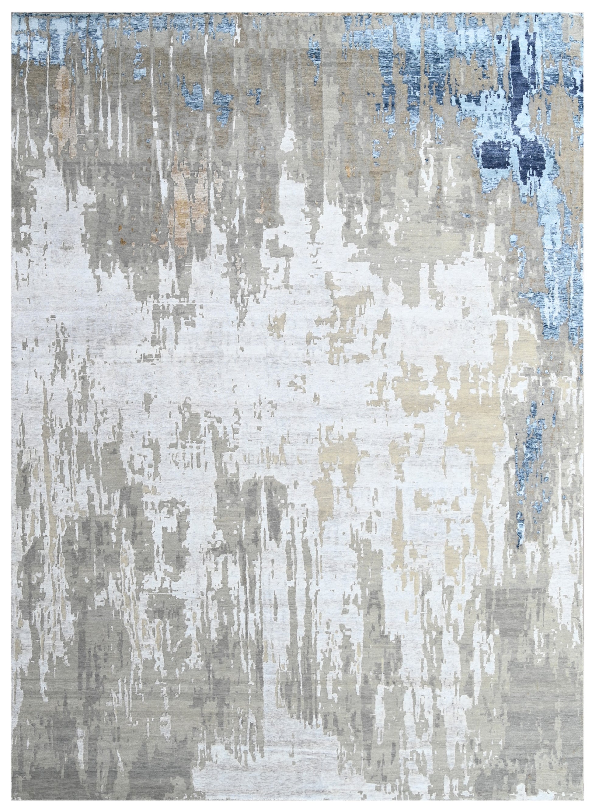 The design draws inspiration from glacial melt cascading into stone, blending organic textures with striking modern contrast. Shades of slate grey, soft ivory, beige, and a cascade of crystalline blues flow vertically across the surface like melting ice on stone cliffs. The result is a captivating visual movement that evokes falling water, weathered rock faces, or abstract rain—adding an energizing calm to any space it occupies. Perfect for interiors that embrace bold minimalism, cool tonal palettes, or natural drama, Glacier Fade is as much a conversation piece as it is a grounding element. The bamboo silk threads shimmer with changing light, while the wool base ensures resilience, warmth, and eco-conscious comfort. Ideal for living rooms, galleries, lofts, or modern sanctuaries, this carpet speaks to those who admire the raw power of nature reinterpreted through a refined lens. With Glacier Fade, bring home a living landscape—one that captures motion, stillness, and the elegance of elemental beauty. |