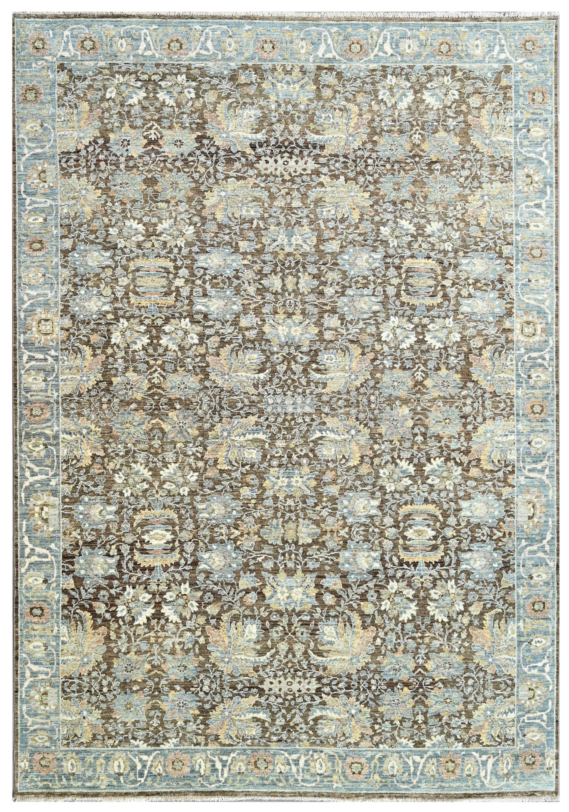 Rich with texture and classic intricacy, Hazelmoor Mahal from our Timeless Collection evokes the enduring beauty of antique Persian garden carpets, reimagined through an earthy, autumnal lens. The rug’s hazel-brown field is densely adorned with floral sprays, curling vines, and symmetrical palmettes in shades of dusty blue, wheat, and parchment. A faded blue border with stylized botanical forms gracefully frames the lush central pattern, offering a grounded balance to the composition.