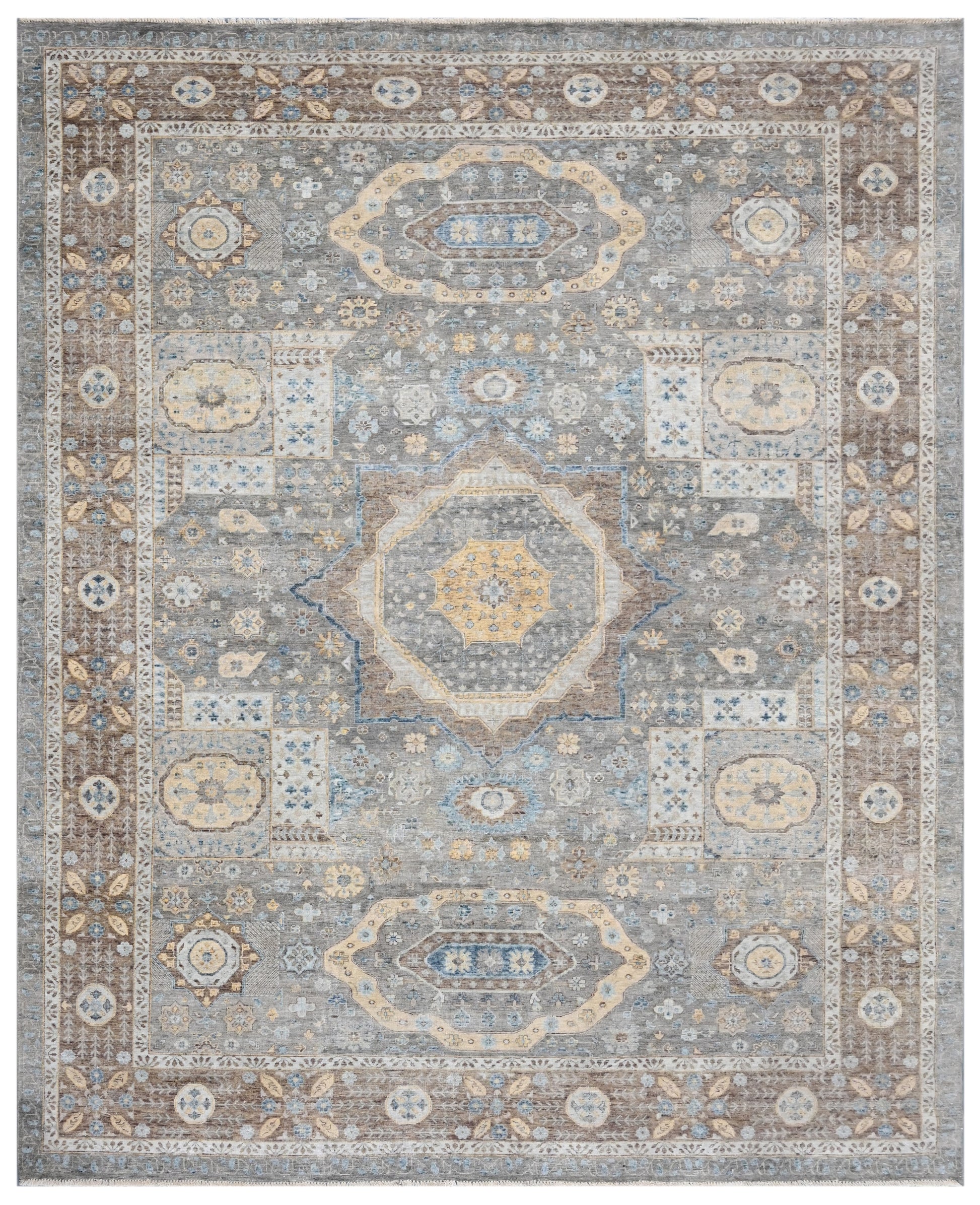 A timeless embodiment of nature’s serene elegance, Legacy draws inspiration from the tranquil beauty of mist-covered mountains and ancient forest canopies. The sophisticated blend of soft greys, warm beiges, and delicate hints of blue mirrors the ethereal glow of morning fog rolling over a timeless woodland landscape. Its intricate medallion design, symmetrically placed within a finely detailed border, evokes the grandeur of antique craftsmanship while embracing a subtle, modern refinement.