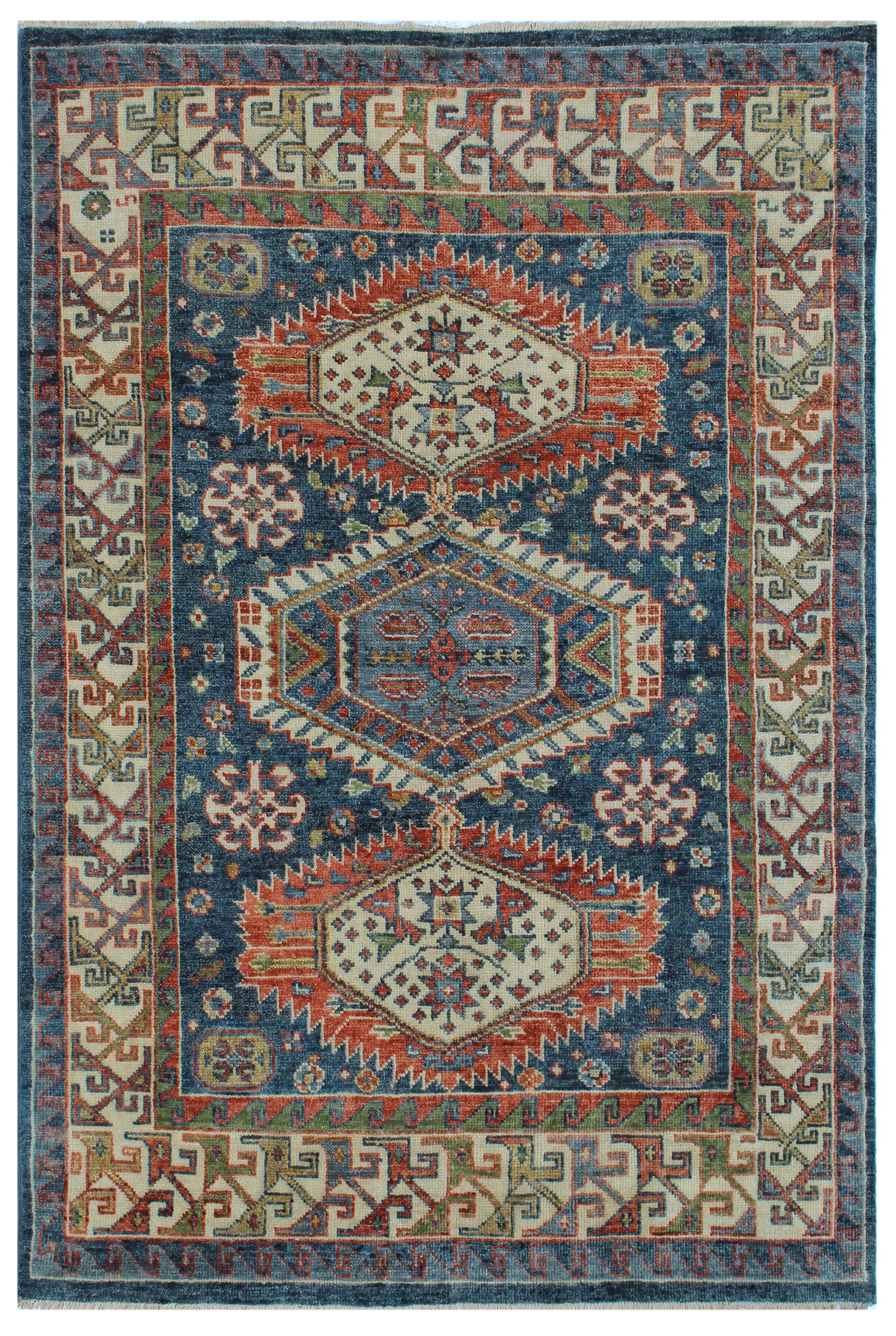 The Minar Wool Carpet is a masterpiece that brings the serene beauty of the ocean and the intricate wonders of nature into your living space. Crafted from the finest wool, this exquisite carpet showcases a stunning array of geometric patterns and vibrant colors that evoke the tranquility and majesty of the sea. The central design features three prominent medallions, each adorned with intricate motifs and surrounded by a rich tapestry of floral and geometric elements. The deep blue background symbolizes the depth of the ocean, while the contrasting hues of red, green, and ivory add a touch of elegance and sophistication. The border is adorned with a series of interlocking geometric shapes, creating a harmonious frame that enhances the overall aesthetic.