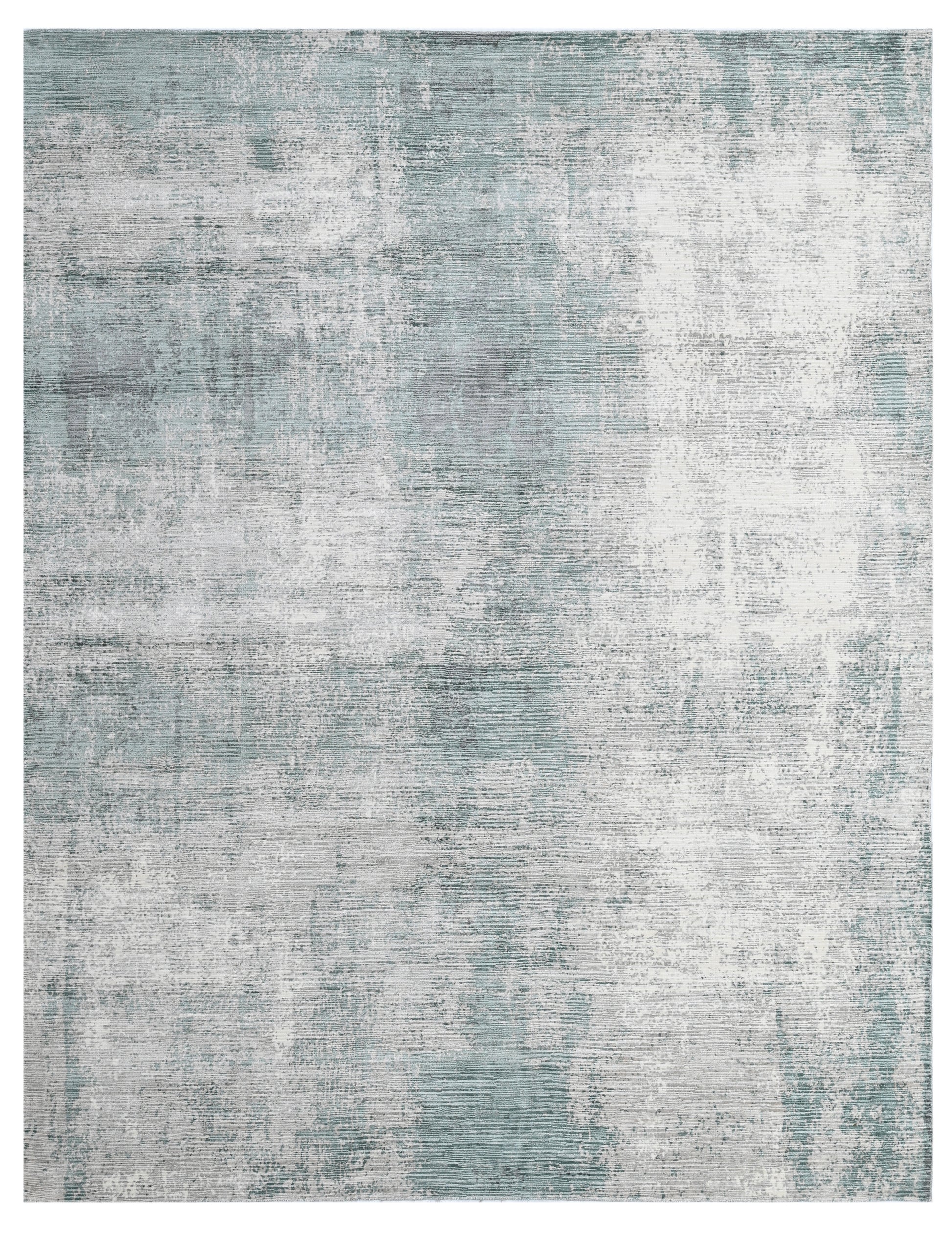 The Mistfall Turquoise rug captures the serene essence of mist drifting over a tranquil sea, blending washed tones of turquoise, soft grey, and silvery white in an abstract, timeworn pattern. Its layered, painterly finish evokes the quiet elegance of natural elements weathered by time, making it a perfect anchor for spaces that embrace calm sophistication.
