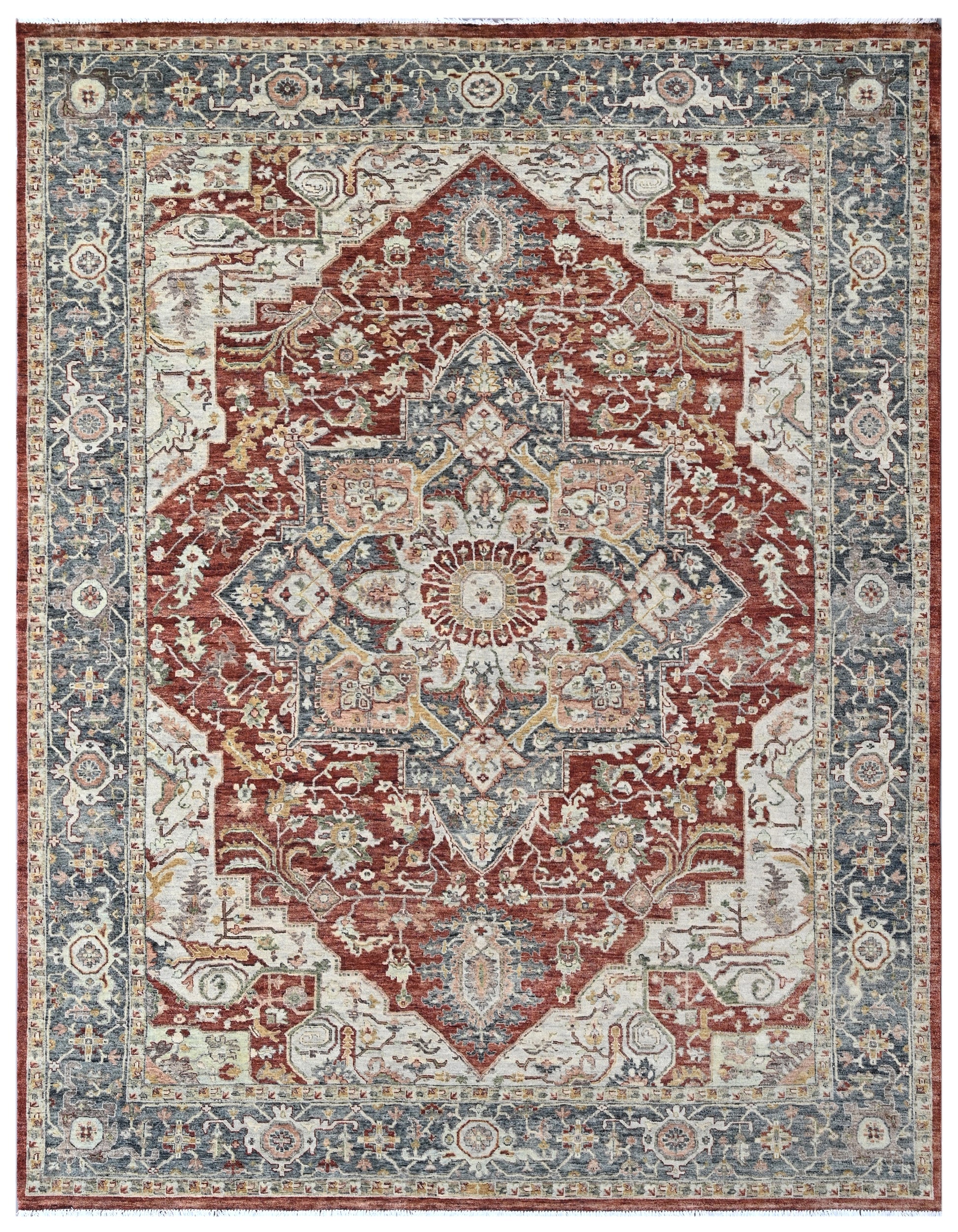 Drawing from the grandeur of ancient Persian artistry, Regal Tabriz is a masterful creation from our Timeless Collection, designed to embody heritage, harmony, and elegance in every knot. The centerpiece of this carpet is its majestic medallion — a symmetrical bloom that radiates outwards with grace, framed by intricate corner motifs and a border rich in floral and vine detailing. Rendered in a rich palette of rust red, antique ivory, and faded sapphire blue, the design evokes a sense of age-old luxury, capturing the enduring spirit of classic Persian craftsmanship.