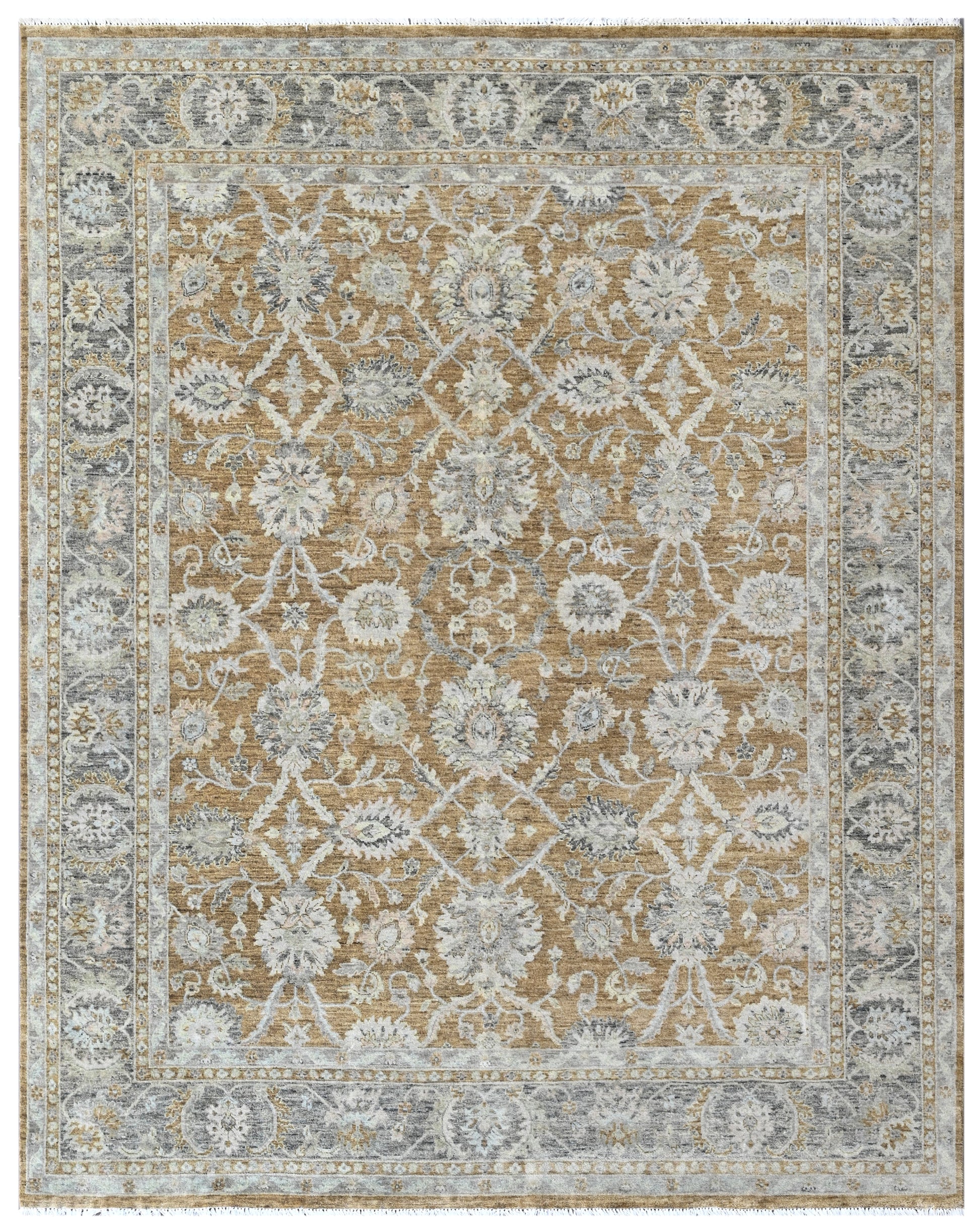 Rich in warmth and regal poise, Saffron Vines from our Timeless Collection draws inspiration from the classic elegance of Mughal and Persian garden carpets. Its golden saffron field forms a radiant backdrop for the silvery-white floral lattice that sprawls with graceful symmetry. Each bloom and tendril is arranged within a diamond framework, offering a sense of structure, movement, and botanical beauty. The soft grey-blue border frames the central composition with intricate floral motifs, grounding the design with quiet dignity.