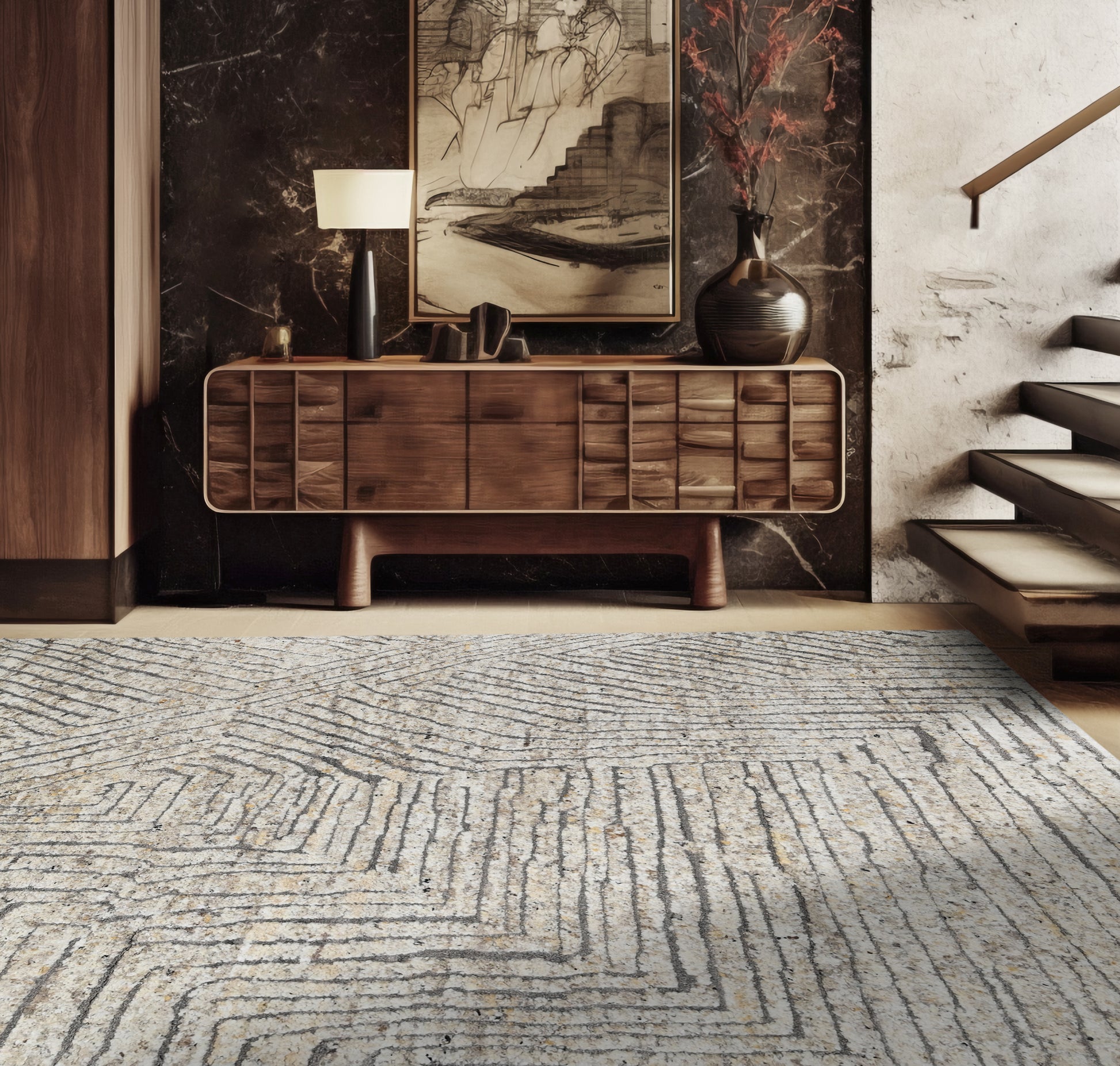 "Inspired by the majestic formations of mountain ridges and the intricate lines carved by time, Sand Dune is a tribute to nature’s artistry. The abstract, geometric pattern mirrors the organic contours of weathered stone, the winding paths of rivers, and the natural flow of the earth’s elements. Its neutral palette, a harmonious blend of soft greys, warm beiges, and deep charcoals, brings an understated elegance that seamlessly integrates into contemporary, modern, and transitional spaces.