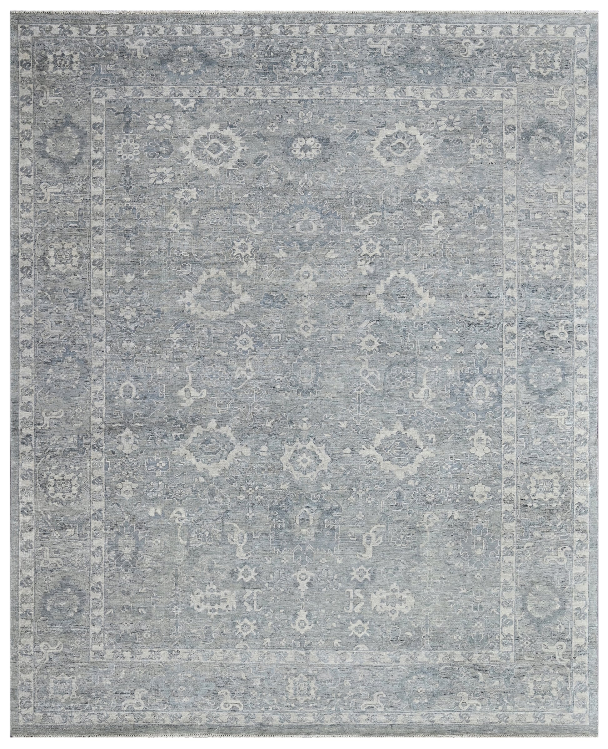 Ethereal and restrained, Silverdust Shiraz from our Timeless Collection captures the quiet beauty of antique Persian rugs reimagined through a cool, modern lens. With a silvery-blue field delicately overlaid by weathered motifs in ivory and pale steel, the design evokes the gentle erosion of time — like ancient patterns slowly emerging through layers of mist. The central medallion and surrounding floral symbols blend seamlessly into the field, offering a soft, atmospheric elegance that brings a calming presence to any interior.