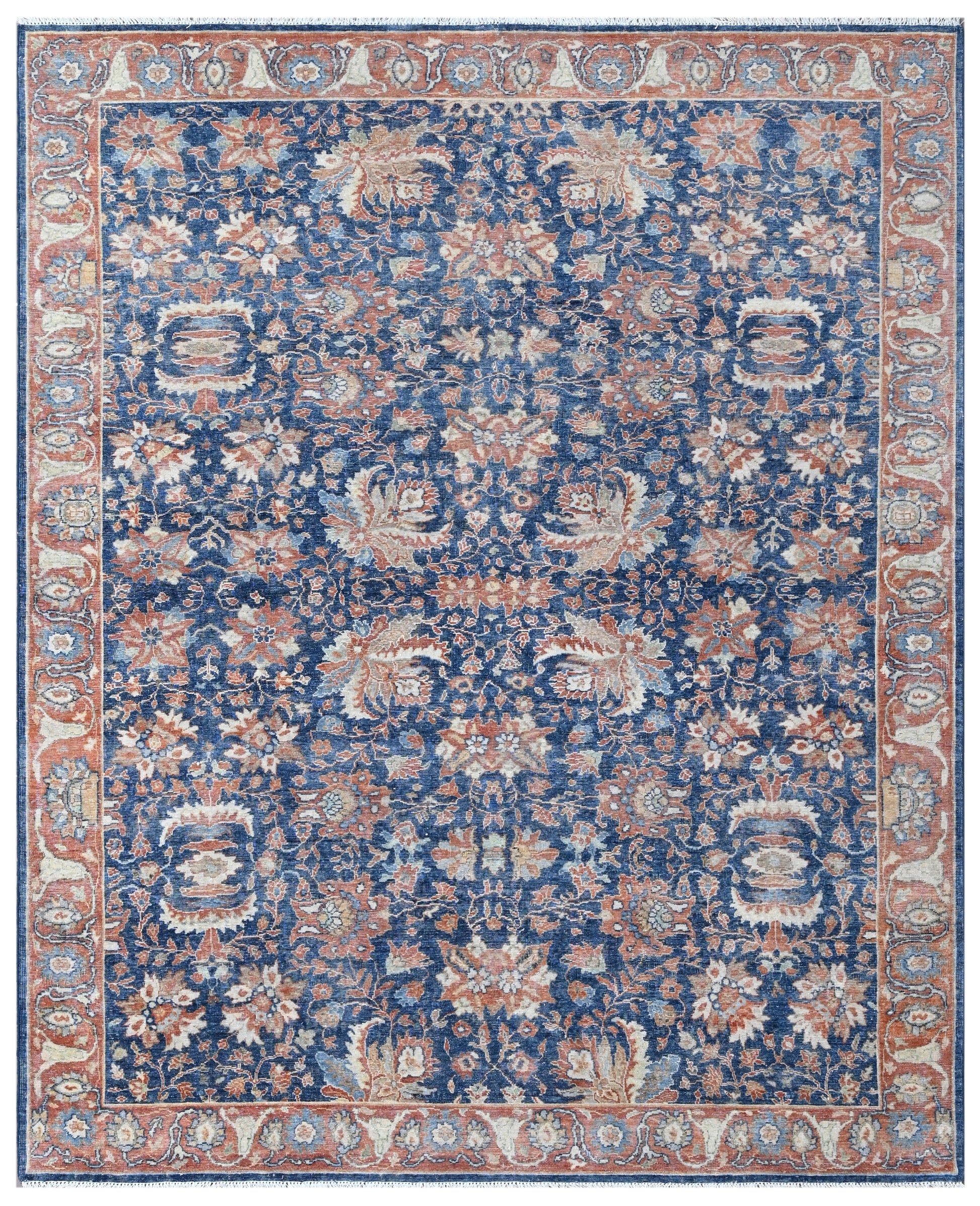 Bold and resplendent, Indigo Mahal from our Timeless Collection pays homage to the grandeur of 19th-century Indian and Persian Mahal carpets. The rich indigo field brims with an exquisite garden of stylized florals, lotus blooms, and curling leaves in warm tones of rust, coral, ivory, and dusty rose. Framed by an ornate border in complementary hues, the carpet radiates a sense of opulence, harmony, and timeless royal character.