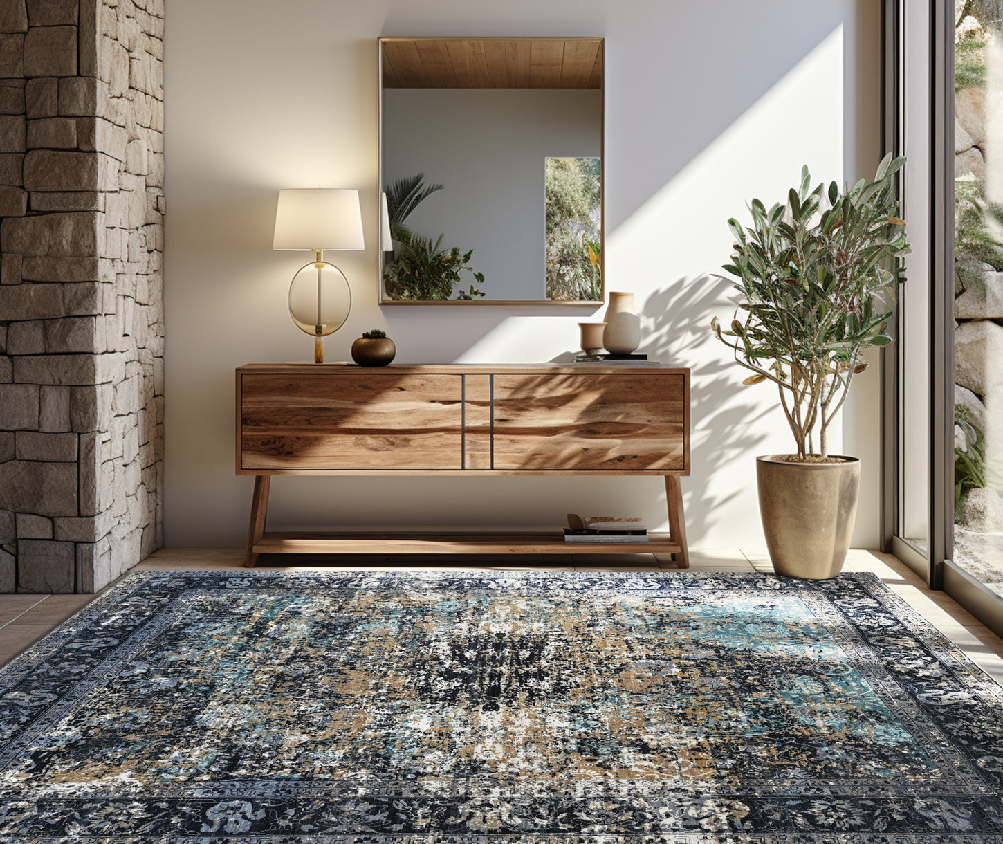 Turquoise Chic embodies the perfect harmony of nature’s fluidity and timeless elegance, inspired by the mesmerizing depths of the ocean. The intricate design, reminiscent of gentle waves, coral formations, and sun-kissed shores, is brought to life with a luxurious blend of handwoven wool and silk. The deep, rich tones of navy and charcoal mirror the enigmatic allure of the sea, while accents of serene aqua and warm sand create a captivating contrast, evoking the essence of water meeting earth.