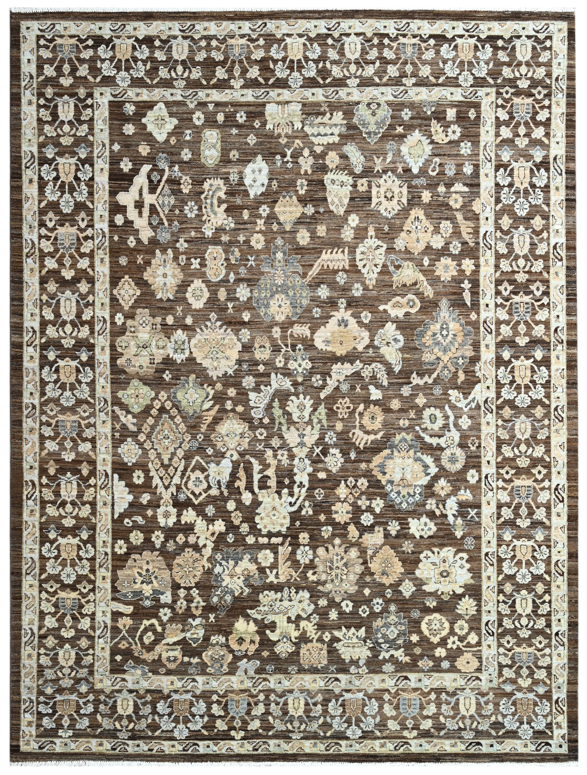 Umber Testament is a richly layered composition in wool, grounded in the warm resonance of deep brown earth tones. Its bold yet balanced palette conjures the texture of ancient manuscripts, where symbols and forms tell stories beneath the surface. The intricate motifs—floral bursts, tribal figures, and geometric flourishes—seem to rise from the dusk-toned field like whispered memories of heritage. It’s a rug that commands attention with quiet sophistication, inviting you to read its woven language at leisure.